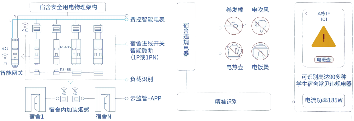 精确到每间宿舍的用电安全(电流电压、温度、 漏电等参数实时监测) 一级计量精度,回路级计量,宿舍能耗精准掌握。
